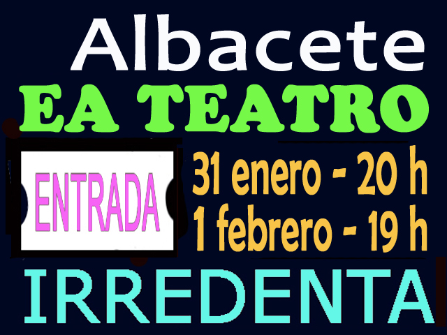 ·······>>         ESTAMOS  PRODUCIENDO  UN  NUEVO  ESPECTÁCULO        << ·······                                                                                                                                      IRREDENTA         sábado 31 de enero a las 20.00 h. y domingo 1 de febrero de 2026 a las 19.00 h. en la sala de Ea!Teatro de Albacete                                     LA ELEGIDA         viernes 13 de febrero de 2026 a las 20.30 h. en el Teatro Bicho de Zaragoza                                     IRREDENTA         20 y 21 de marzo a las 20,00 h. y 22 de marzo de 2026 a las 19,00 h. en el Teatro del Mercado de Zaragoza